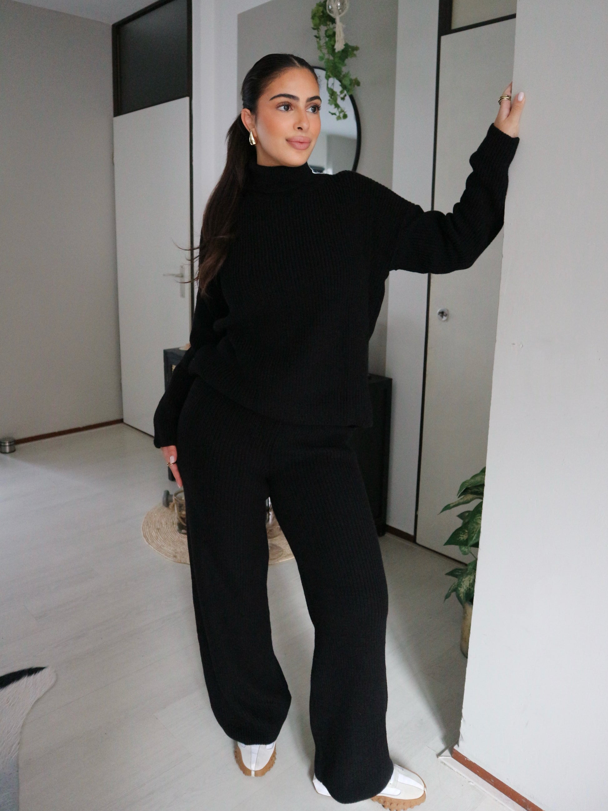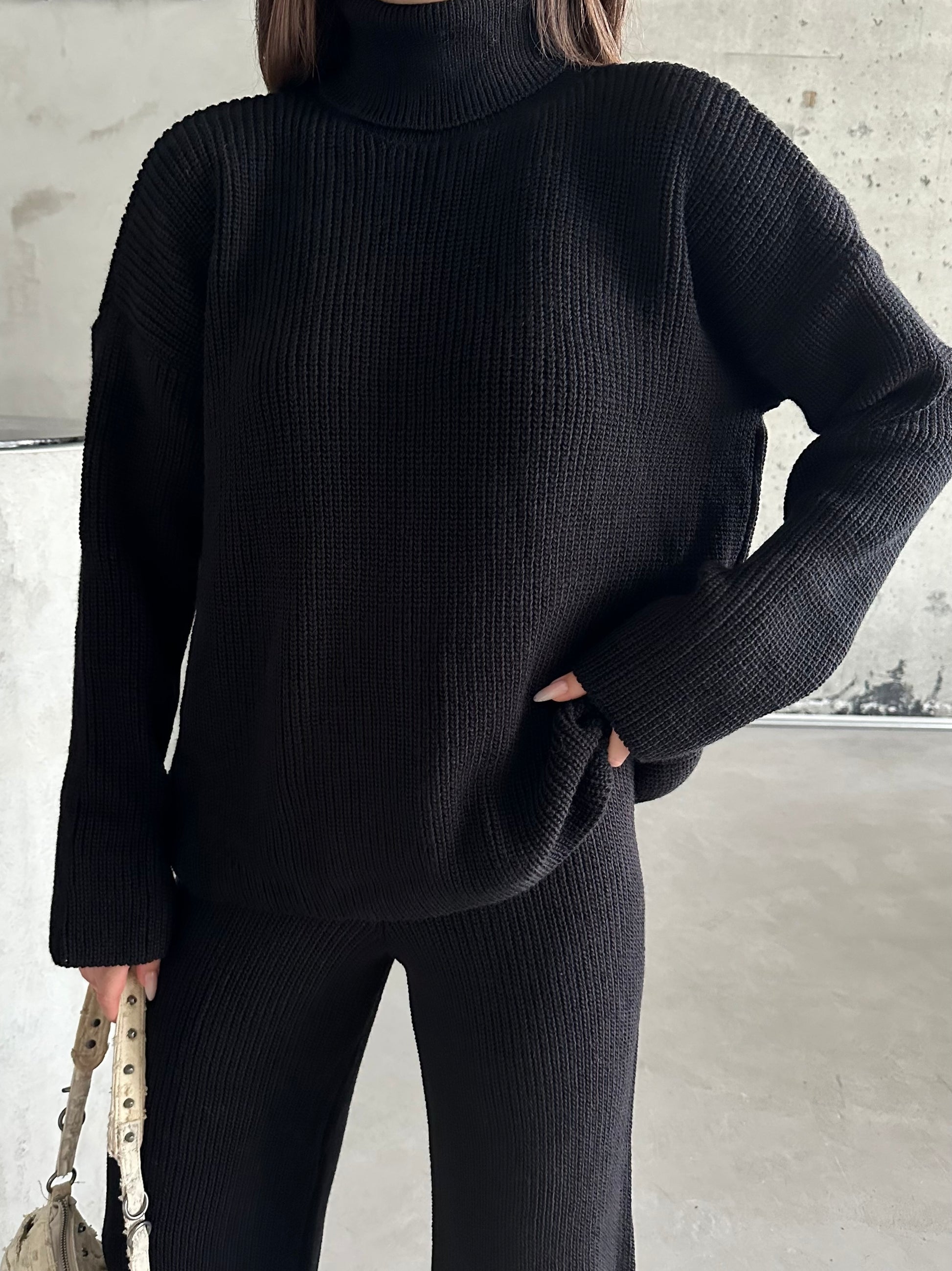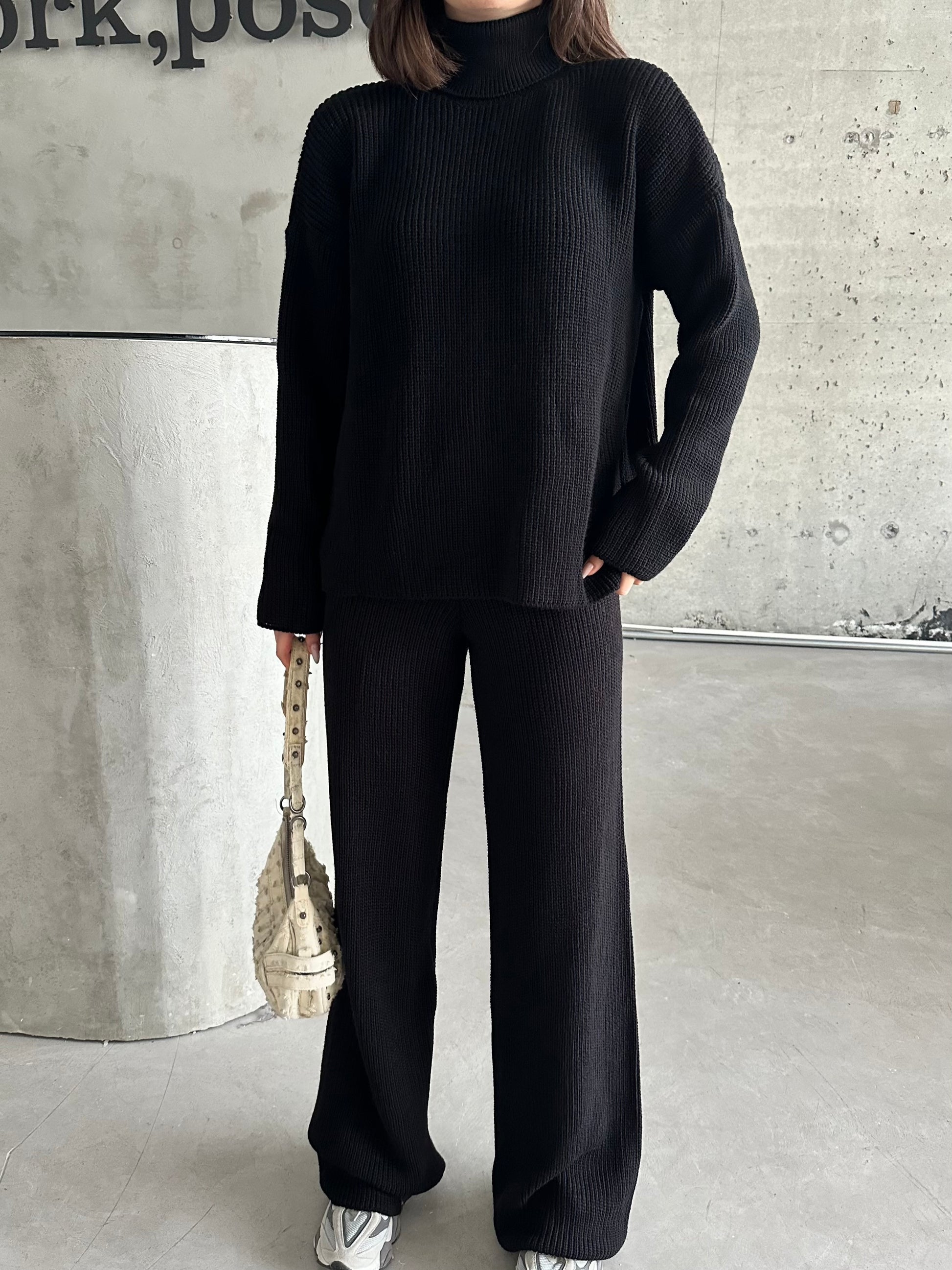 This black Lily set has a turtleneck and is knitted.