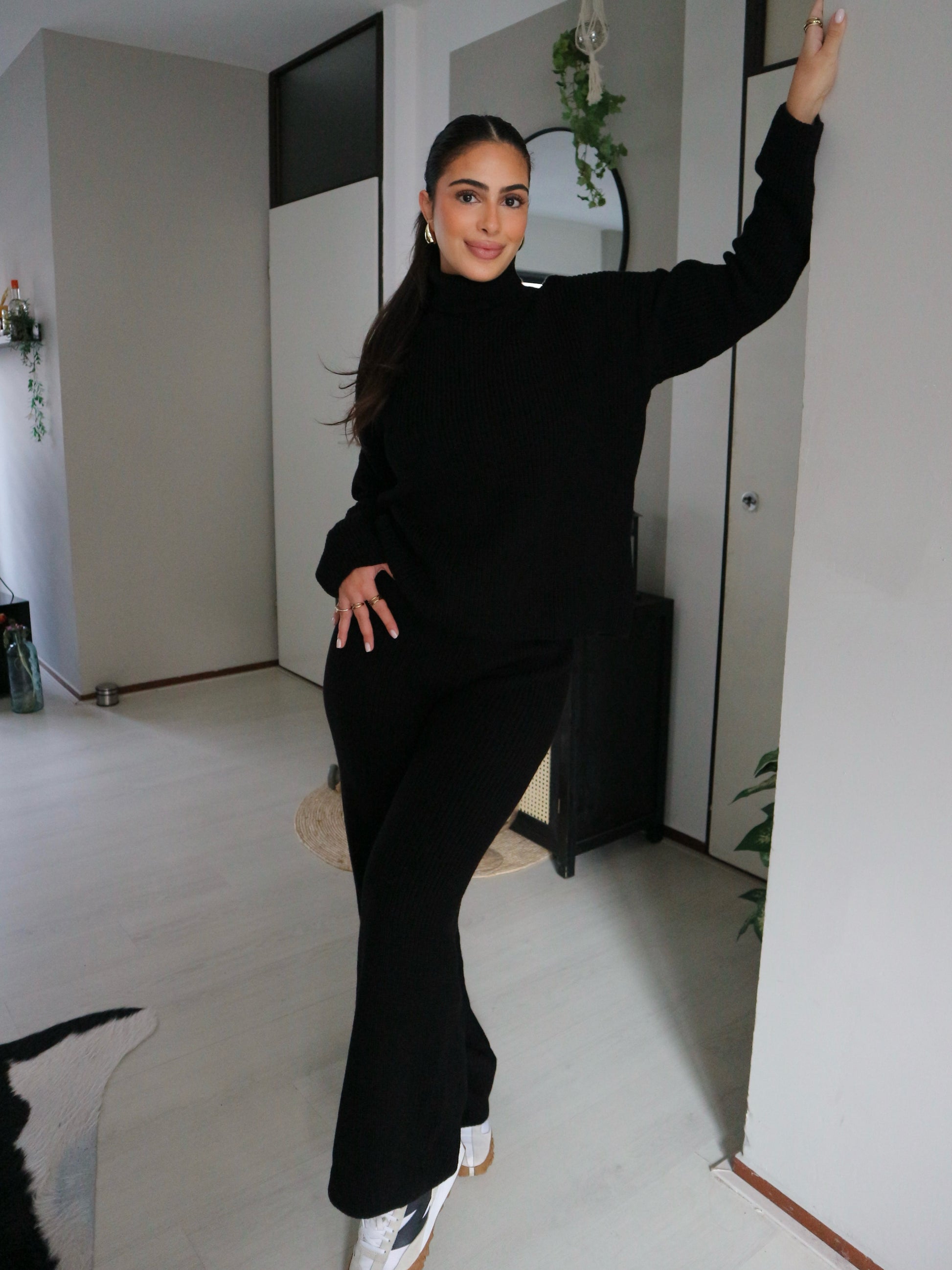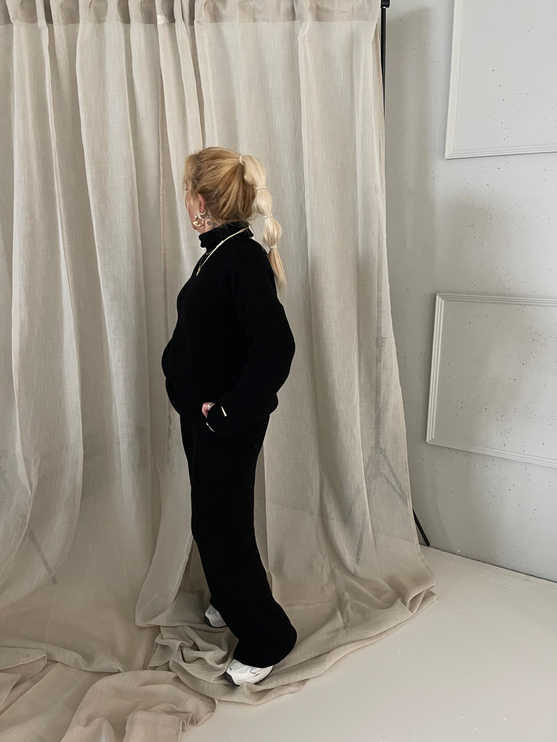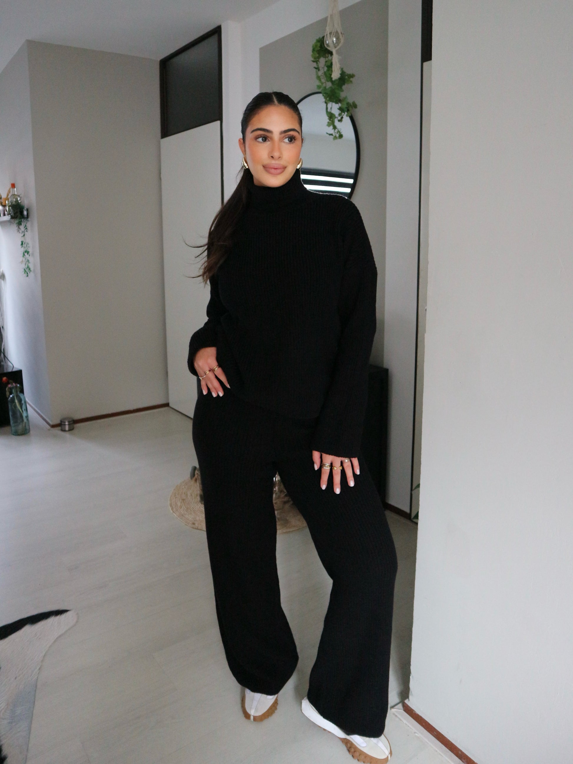 This black Lily set has a turtleneck and is knitted.